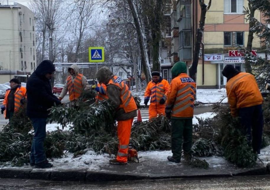10-метрову ялинку наразі прибирають комунальники. Вони збирають впале гілля, щоб звільнити пішоходам прохід через дорогу. Як повідомили у міськраді, з ночі надійшло вже 20 заявок до аварійних бригад. Комунальники працюють з шостої ранку, щоб прибрати всі впалі дерева.