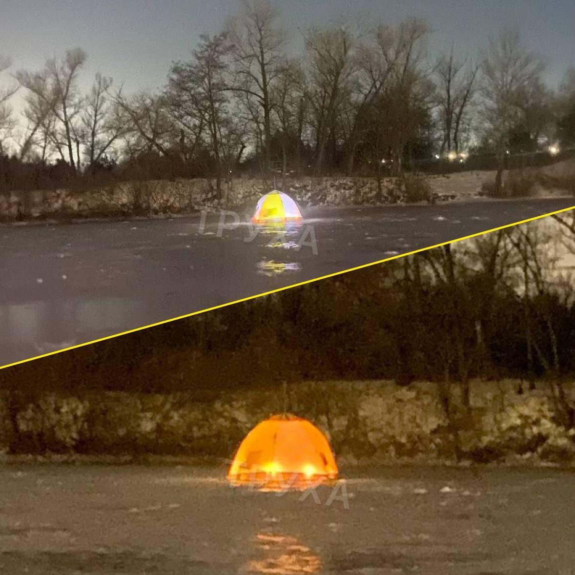 Намет яскраво світиться, тому цілком можливо, що хтось все ж вирішив влаштувати нічний кемпінг посеред замерзлої водойми.