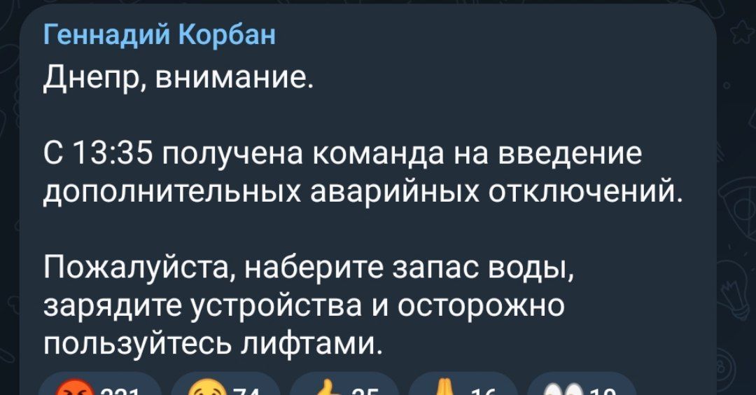 З 13:35 отримано команду на запровадження додаткових аварійних відключень у Дніпрі. Про це повідомила міська влада. Скільки годин триватимуть відключення, невідомо.