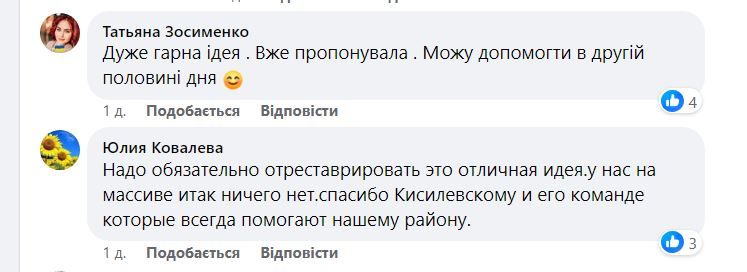 Зробити петриківський розпис на тих скульптурах які вистояли, а навколо висадити жовто блакитні квіти, можливо поруч квітники з лози в українському народному стилі. Мені здається, такі маленькі "острівці" створювали би приємний настрій у людей, а це дуже важливо в такий складний час, - пише пані Анна.