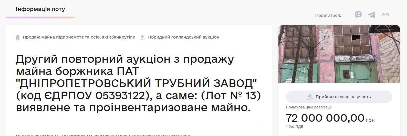 На сайті Prozzoro з'явилося оголошення з повторного продажу майна боржника ПАТ "Дніпропетровський трубний завод". Аукціон проводять за голландською схемою, тобто на пониження ціни.