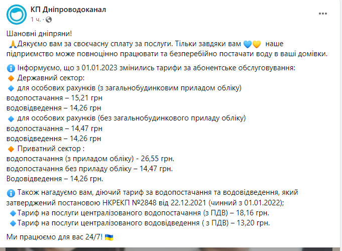 У КП також зазначили, що тариф за водопостачання та водовідведення не змінився та становить: