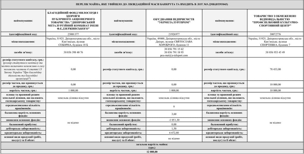 Нещодавно відбулися торги під час яких розпродавали майно збанкрутілого Дніпровського металургійного комбінату. Цього разу на до "ліквідаційної маси" увійшло об'єднання підприємств "Укрметалургпром" (21926977).