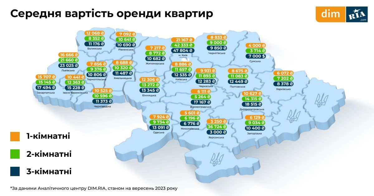 Однокімнатна в середньому обійдеться в 10 тисяч 627 гривень, двокімнатна 14 тисяч 315 гривень та трикімнатна - 18 тисяч 515 гривень.