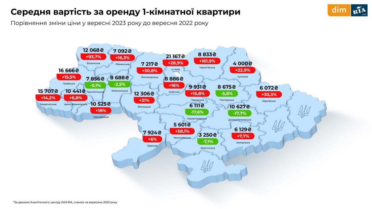 За рік ціна на оренду однокімнатної квартири в Дніпрі знизилася на 20%, двокімнатні здешевшали на майже 9%. Що цікаво, у більшості регіонів України ціни навпаки зросли. Навіть у Харкові, де ситуація з обстрілами не сильно поліпшилася.