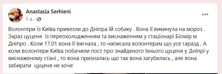 Волонтери з Києва привезли до Дніпра їй собаку. Вона її викинула на мороз, – зазначили в дописі.