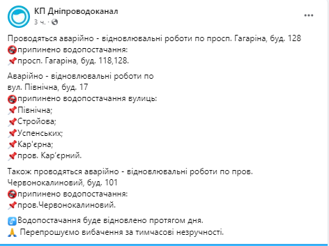 Так, у зв'язку з проведенням аварійно-відновлювальних робіт на просп. Гагаріна, 128; вул. Північній, 17; у пров. Червонокалиновому, 101 припинено водопостачання: