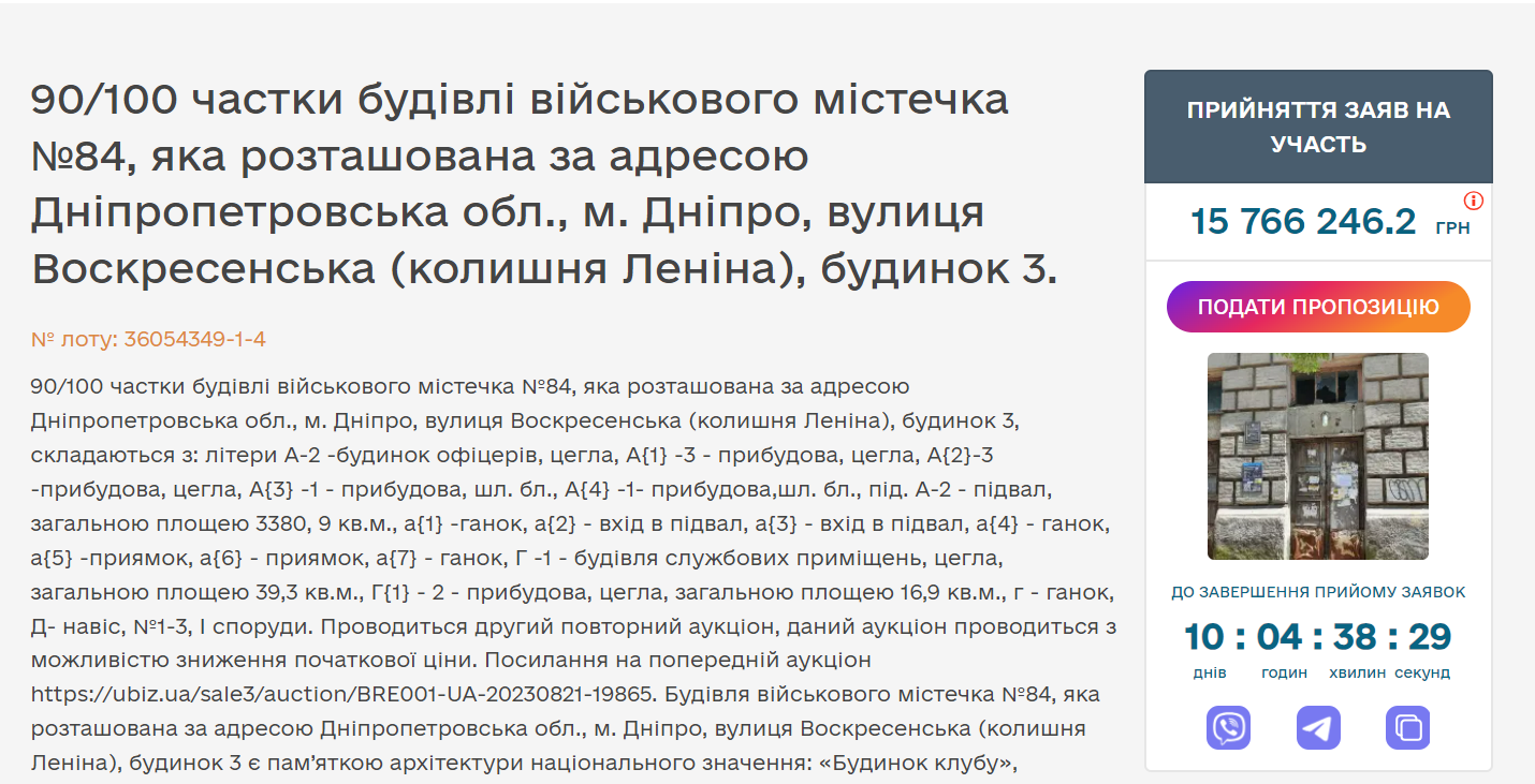 Стартова ціна – 15,76 млн грн. Сам аукціон відбудеться 11 вересня.