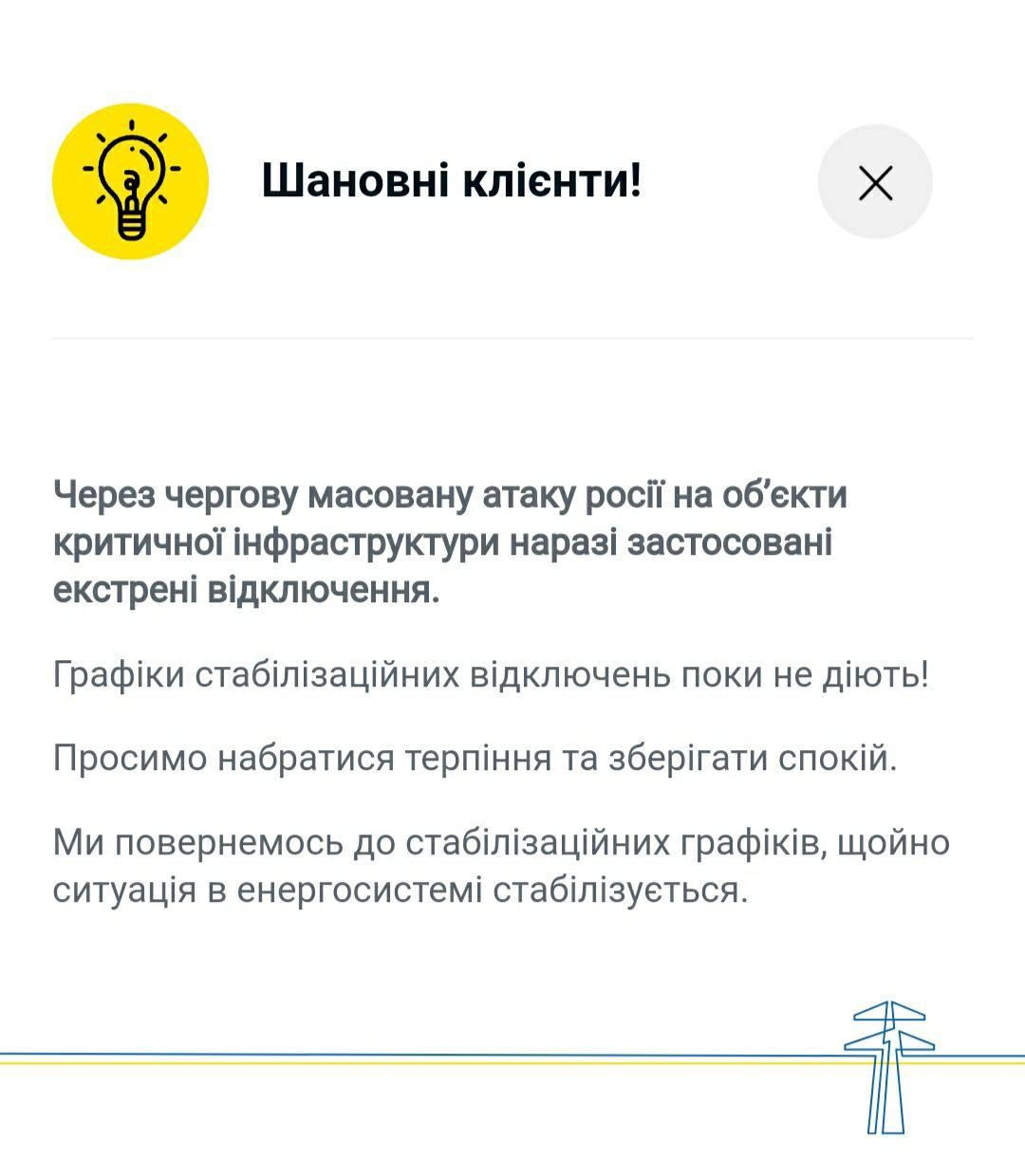 На початку тижня область повернулася до стабілізаційних відключень, але через те, що в понеділок росіяни знову обстріляли об'єкти енергетичної інфраструктури - графіки знову не діють.