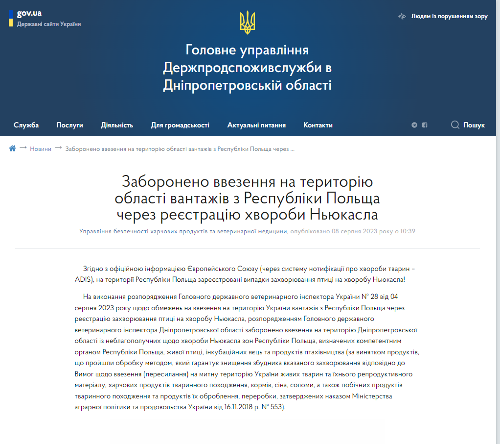 З 4 серпня головний державний ветеринарний інспектор Дніпропетровської області обмежив ввезення на територію регіону певних продуктів з Республіки Польща через реєстрацію захворювання птиці на хворобу Ньюкасла.