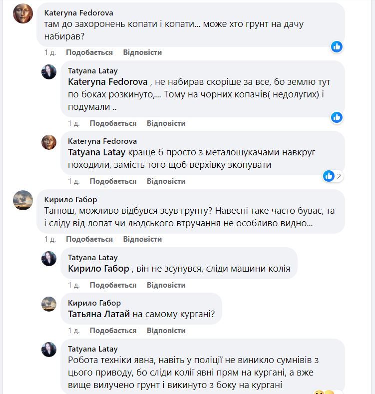 Тетяна зазначила, що вже звернулася до правоохоронців, які попередньо підтвердили версію про "чорних" копачів. За словами краєзнавиці, трав'яний покрив на кургані порушили минулою весною чи літом, тому що на місці "розкопок" вже почала рости нова трава.