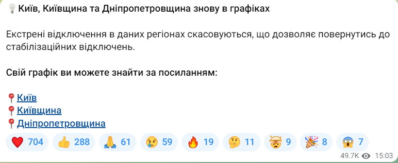 Після 15:00 в ДТЕК повідомили, що Дніпропетровщина повертається до стабілізаційних відключень.