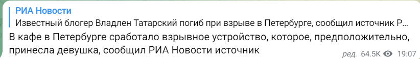 У кафе в Санкт-Петербурзі пролунав "хлопок": загинув російський воєнкор-пропагандист Татарський