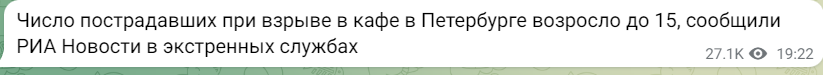 У центрі Санкт-Петербурга в кафе "Стріт-бар" на Університетській набережній пролунав, як пише російське пропагандистське видання "Ріа Новини", "хлопок".