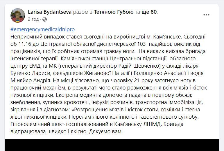 Як повідомила медик, виклик надійшов 27 листопада об 11:16. Працівники повідомили, що їхній колега травмував ногу. На місце виїхала бригада інтенсивної терапії. З'ясувалося, що ногу 21-річного чоловіка затягнуло у працюючий механізм на виробництві. Внаслідок цього у нього пошкодилися м'язи та кістки нижньої кінцівки.