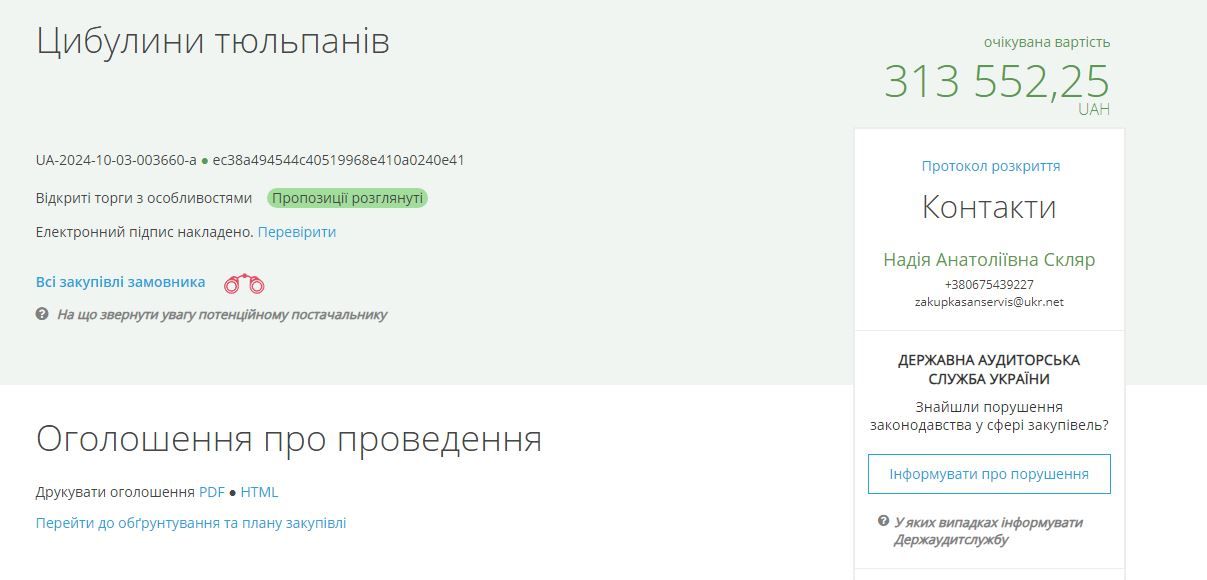 Майбутній виконавець має надати тюльпани до 15 листопада 2024 року. Очікувана вартість становила 313 552,25 гривні.