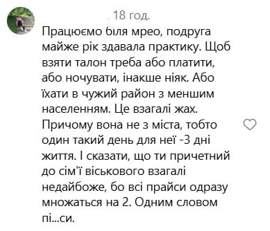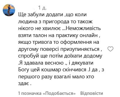 У коментарях користувачі діляться своїм досвідом: багатьом також доводилося годинами, а то і днями, "полювати" на талон. Одні розповідають, як приходили під центр о 4–5 ранку, інші зізнаються, що змушені були відкладати складання іспиту на місяці через відсутність місць. Люди обурюються, що скласти практичний іспит і отримати посвідчення водія зараз дуже складно.