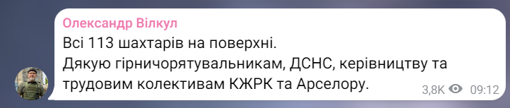 Усі 113 шахтарів на поверхні. Дякую гірничорятувальникам, ДСНС, керівництву та трудовим колективам КЖРК та Арселору, - написав він.