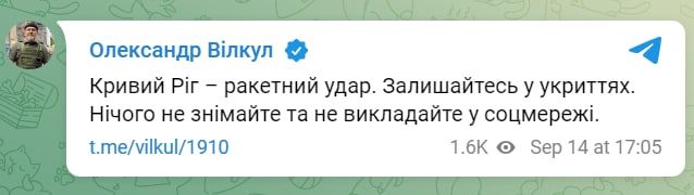 Начальник військової адміністрації Кривого Рогу Олександр Вілкул підтвердив ракетний удар по місту. Він закликає залишатися в укриттях.