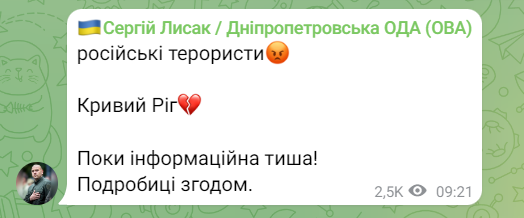 російські терористи. Кривий Ріг. Поки інформаційна тиша! Подробиці згодом, - написав він.