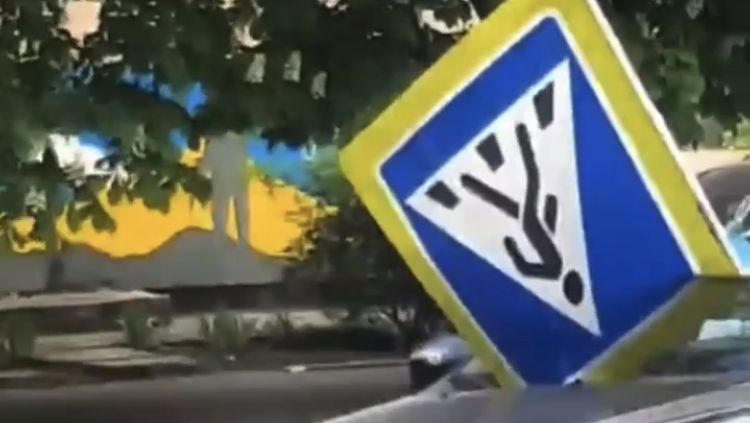 Внаслідок ДТП водій КІА збив знак пішохідного переходу, який впав та застряг в капоті автівки.