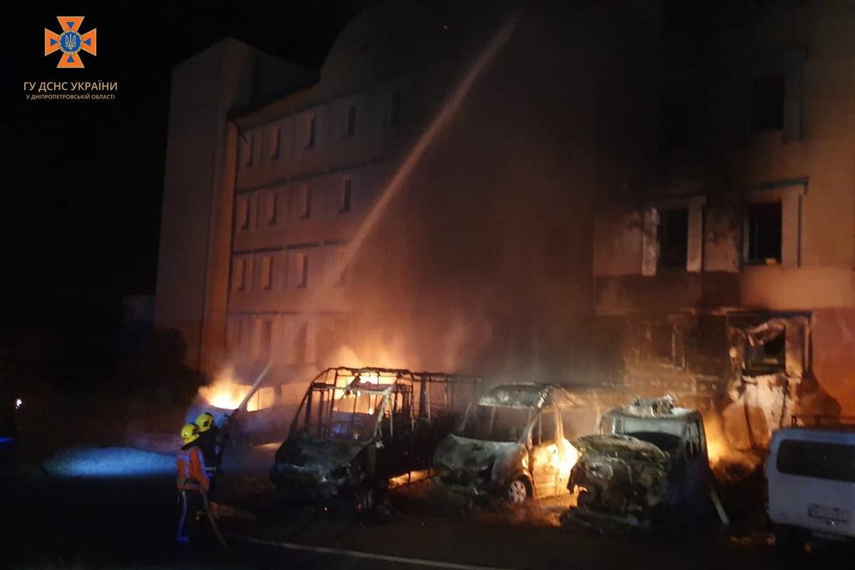 Рятувальники оперативно виїхали на місце. Прибувши, вони встановили, що на тимчасовій зупинці горять п’ять мікроавтобусів та вогонь перекинувся на дах 4-поверхової неексплуатуємої будівлі.