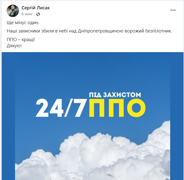 Ще мінус один. Наші захисники збили в небі над Дніпропетровщиною ворожий безпілотник. ППО – кращі! Дякую! - написав він.