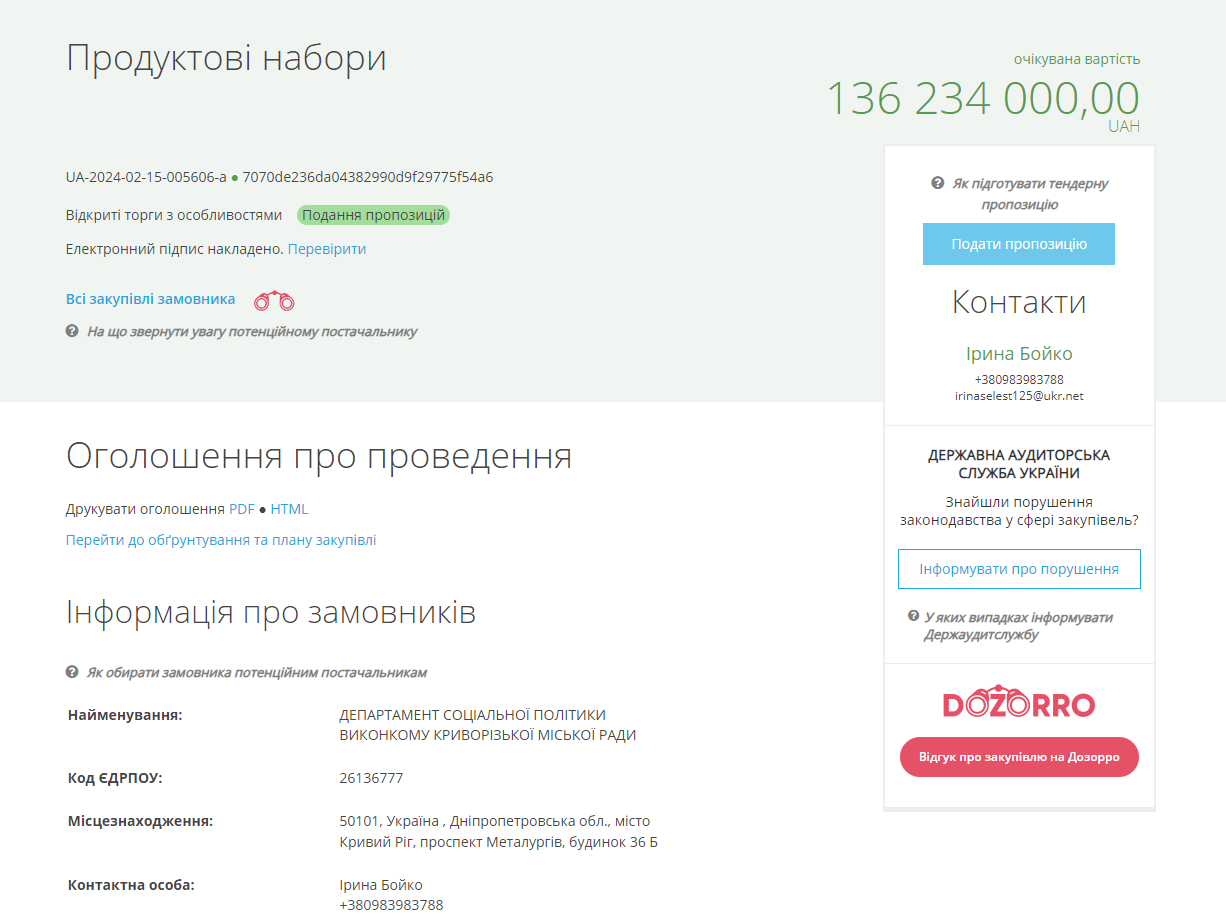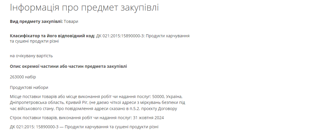 Замовником виступає Департамент соціальної політики виконкому Криворізької міської ради. За умовами тендеру, департамент планує закупити 263 000 наборів на загальну суму 136 234 000 грн. Якщо порахувати, то вартість одного буде складати 518 грн.