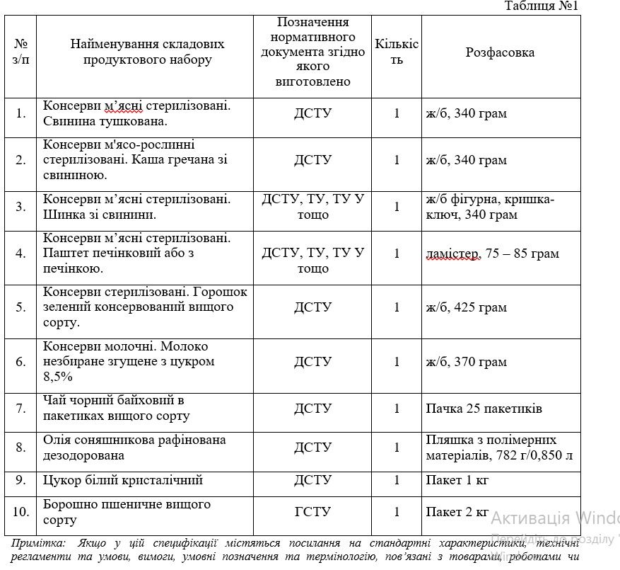 До набору входитимуть 6 видів консервів, чай, олія, цукор, борошно. Перелік на фото: