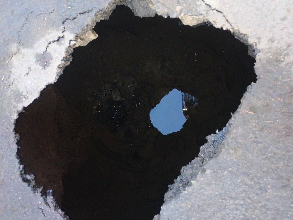 Кількаметровий отвір в асфальті знаходиться якраз там, де кожного дня проїжджають десятки авто, а також маршрутка №21.