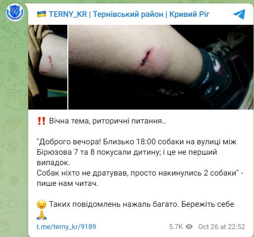 Близько 18:00 собаки на вулиці Бірюзова між 7 та 8 будинками покусали дитину. І це не перший випадок. Собак ніхто не дратував, просто накинулись 2 собаки, - написали містяни.