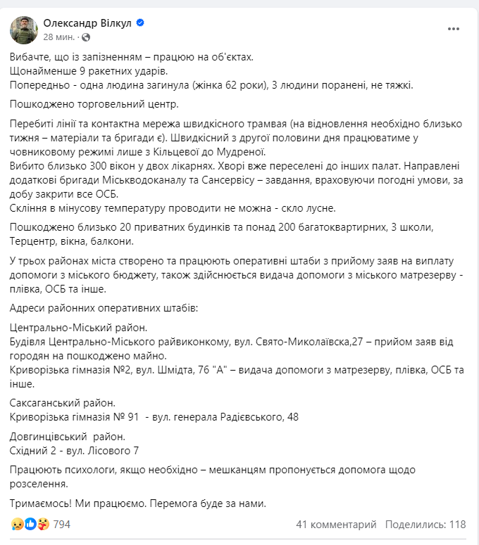 У трьох районах міста створено та працюють оперативні штаби з прийому заяв на виплату допомоги з міського бюджету, також здійснюється видача допомоги з міського матрезерву - плівка, ОСБ та інше. Працюють психологи, якщо необхідно – мешканцям пропонується допомога щодо розселення, - написав Вілкул.