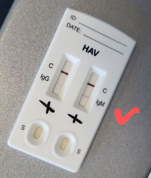 HAV - це Гепатит А Вірус.Літера C - це контроль якості тесту, і ми бачимо чіткі смужки, тобто тест працює добре.Ig M - це антитіла, яки з`являються першими, та Ig G - це антитіла, яки з`являються пізніше, - зазначила лікарка.