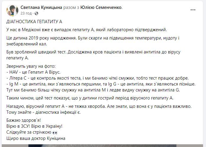 За словами медика, смужку на антитіла М видно добре, а на антитіла G - погано. Це вказує на те, що у дитини гострий період вірусного гепатиту А.