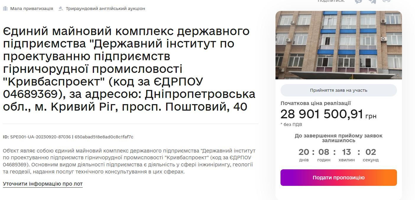 Торік "Кривбаспроект" та все майно інституту передали до Фонду держмайна для приватизації. Тепер оголосили аукціон під час якого хочуть продати приміщення установи. До цього деякі із них здавали в оренду.