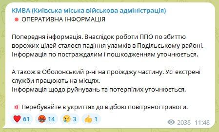 Також, за інформацією КМВА, внаслідок роботи ППО сталося падіння уламків в Подільському районі. Інформація по постраждалим і пошкодженням уточнюється.