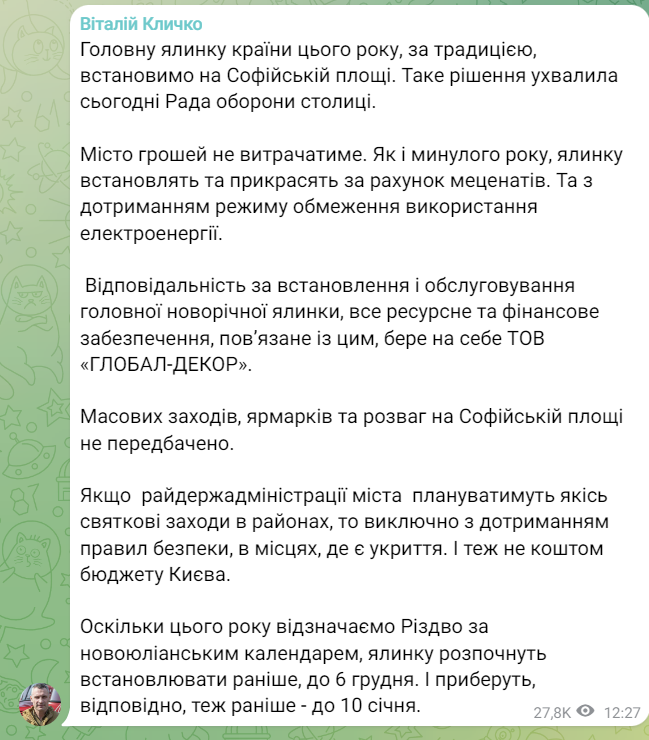 Місто грошей не витрачатиме. Як і минулого року, ялинку встановлять та прикрасять за рахунок меценатів. Та з дотриманням режиму обмеження використання електроенергії, - зазначив Кличко.