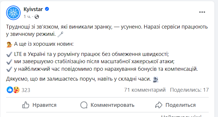 Труднощі зі зв’язком, які виникали зранку, — усунено. Наразі сервіси працюють у звичному режимі. А ще із хороших новин: LTE в Україні та у роумінгу працює без обмеження швидкості; ми завершуємо стабілізацію після масштабної хакерської атаки; у найближчий час повідомимо про нарахування бонусів та компенсацій, - йдеться у повідомленні.