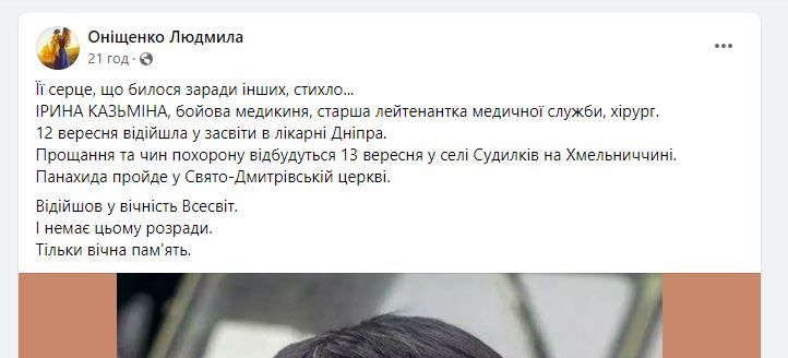 У лікарні Дніпра зупинилося серце військової медикині Ірини Казьміної.