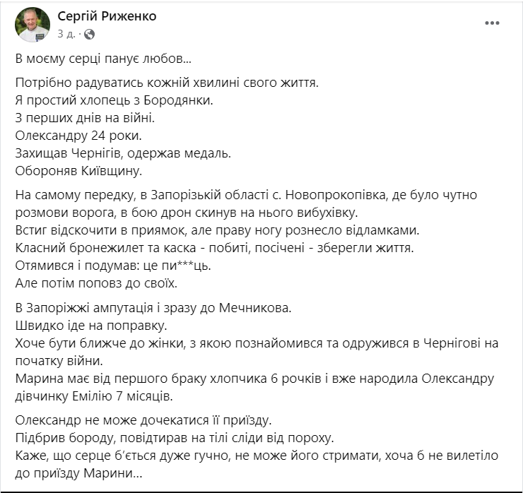 Хоче бути ближче до жінки, з якою познайомився та одружився в Чернігові на початку війни. Марина має від першого браку хлопчика 6 рочків і вже народила Олександру дівчинку Емілію 7 місяців. Олександр не може дочекатися її приїзду, - зазначив гендиректор.