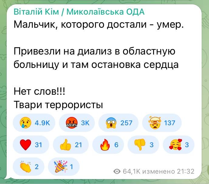 Нагадаємо, що у ніч проти 13 жовтня російська армія випустила по Миколаєву вісім ракет С-300. Одна з них влучила в житловий будинок. На місцях прильотів працювали рятувальники, які шукали під завалами людей. Коли працівники ДСНС знайшли хлопчика під завалами будинку, він ще був живим. Дитину госпіталізували та намагались врятувати.