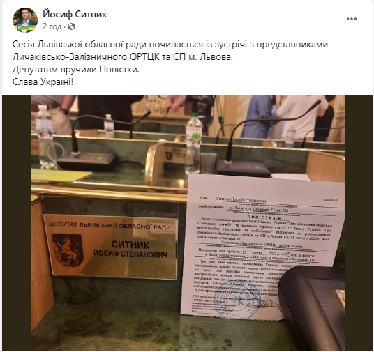 Сесія Львівської обласної ради починається із зустрічі з представниками Личаківсько-Залізничного ОРТЦК та СП м. Львова. Депутатам вручили Повістки. Слава Україні!, — написав Йосиф Ситник.