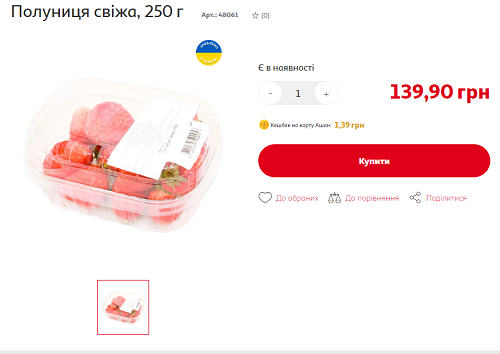 У торговельній мережі «Ашан» за аналогічне пакування полуниці просять менше – майже 140 грн. у такому разі кілограм ягоди коштуватиме 560 грн.