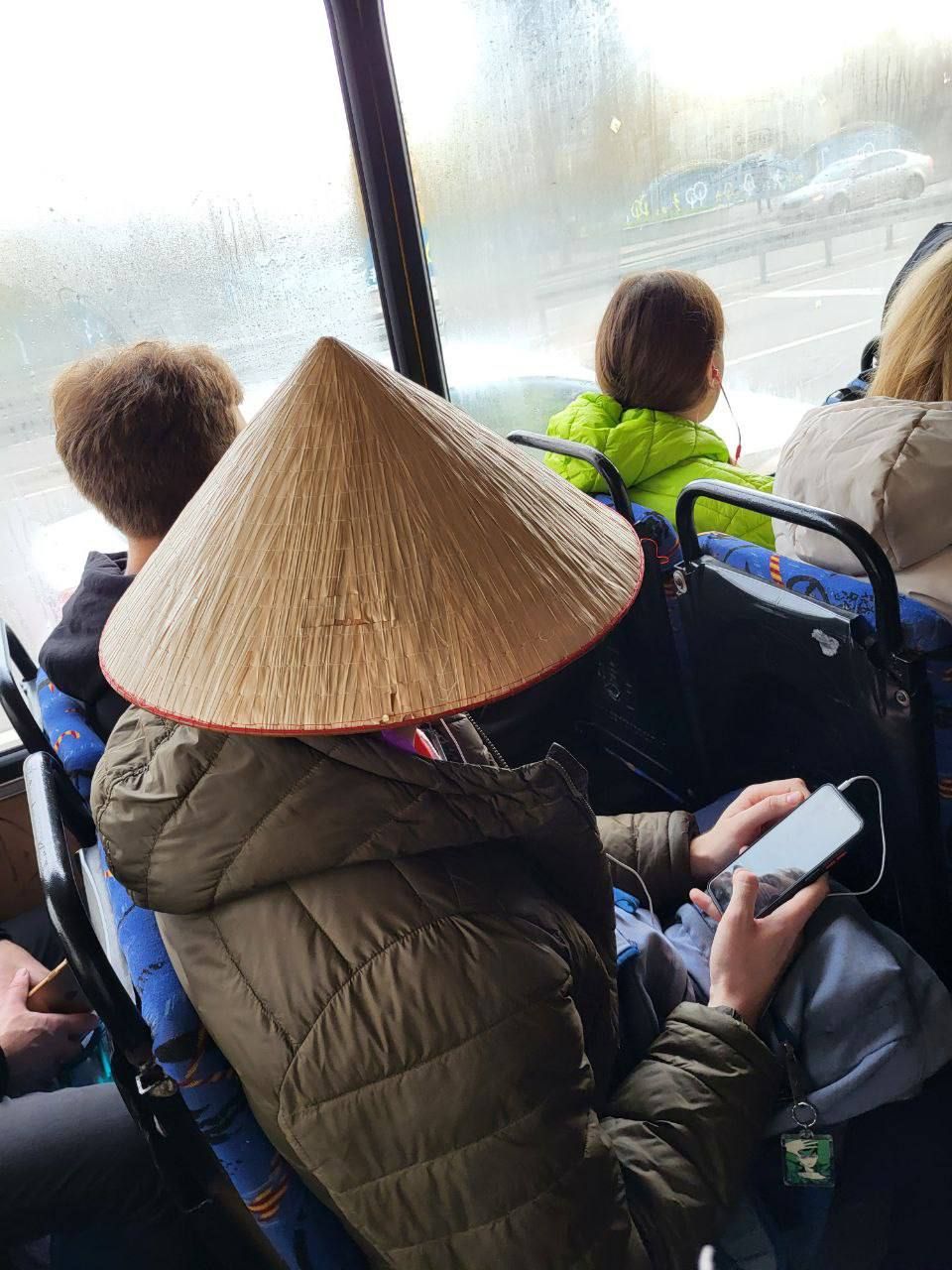 Один із пасажирів їхав в салоні в солом'яному трикутному капелюсі. Схожий головний убір носять в Китаї для захисту від сонця та дощу.