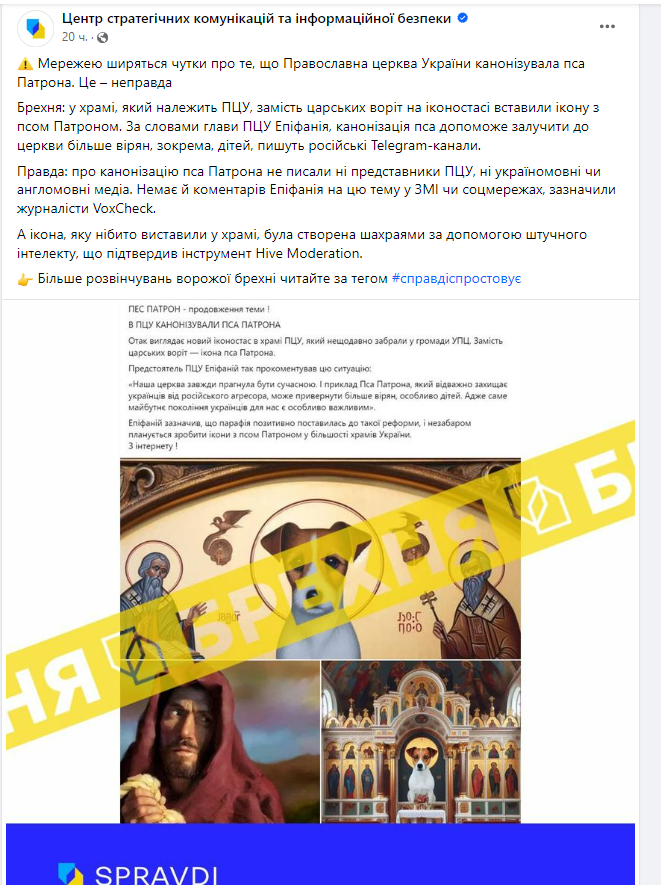 Правда: про канонізацію пса Патрона не писали ні представники ПЦУ, ні україномовні чи англомовні медіа. Немає й коментарів Епіфанія на цю тему у ЗМІ чи соцмережах, - йдеться у повідомленні.
