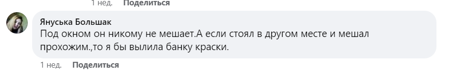 Під вікном він нікому не заважає, а якщо стояв в іншому місці і заважав перехожим, то я б вилила банку фарби, - написала дніпрянка Яна Большак.