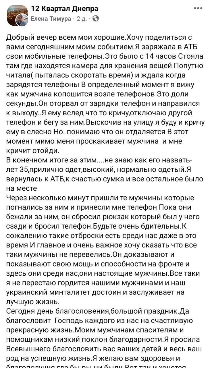 У якийсь момент до неї підійшов якийсь чоловік. Спочатку жінка не звернула увагу на дніпрянина, адже розетками користувалася не вона одна. Але потім незнайомець забрав її телефон та намагався швидко вийти з магазину. Олена взяла другий телефон та попрямувала за крадієм. Вона кричала йому вслід, щоб той зупинився, але незнайомець не реагував. За словами Олени, крадієві було на вигляд 35 років, він був охайно одягненим.