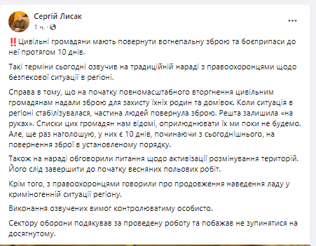 За його словами, на початку повномасштабного вторгнення цивільним громадянам надали зброю для захисту їхніх родин та домівок. Коли ситуація в регіоні стабілізувалася, частина людей повернула зброю. Решта - залишила «на руках».