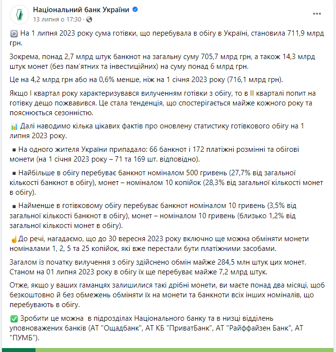 Загалом із початку вилучення з обігу здійснено обмін майже 284,5 млн штук цих монет. Станом на 1 липня 2023 року в обігу їх ще перебуває майже 7,2 млрд штук, — йдеться у повідомленні НБУ.