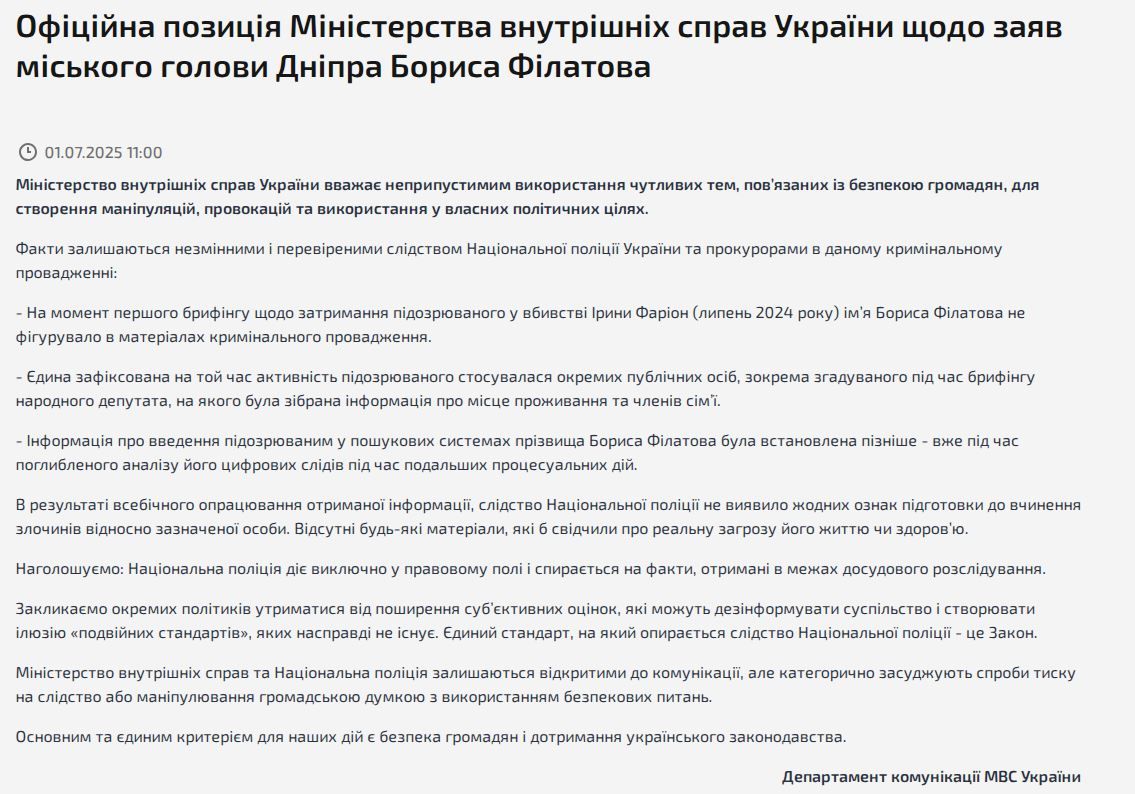 Раніше міський голова Дніпра Борис Філатов вдруге звернувся з офіційним листом до міністра внутрішніх справ Ігоря Клименка — через мовчання правоохоронного відомства після шокуючих фактів, оприлюднених під час судового розгляду у справі про вбивство Ірини Фаріон.